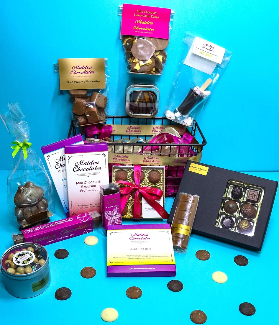 A specially arranged hamper with even more of our handmade, luxury chocolates, beautifully packaged in a useful, larger, metal basket. The perfect gift for all chocolate lovers!